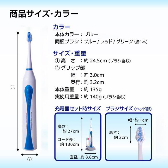 付属品:取扱説明書(保証書付)、充電器、替えブラシスタンドカバー、標準ブラシ×3本
