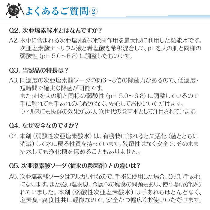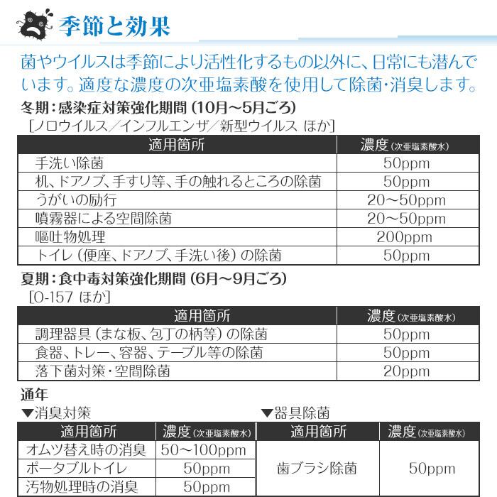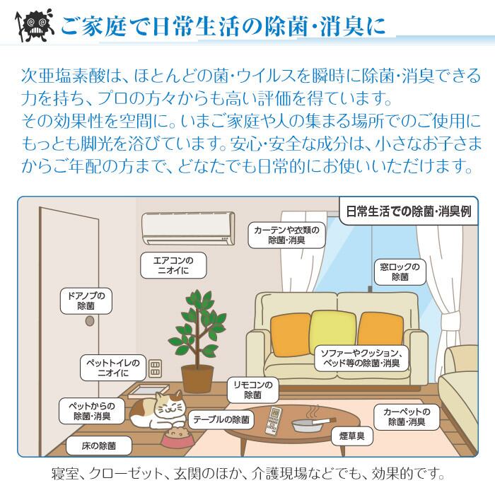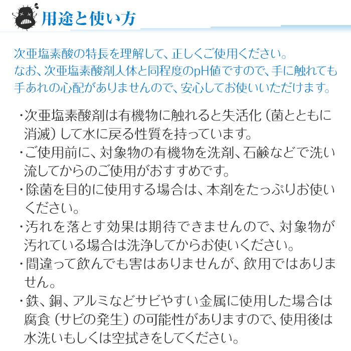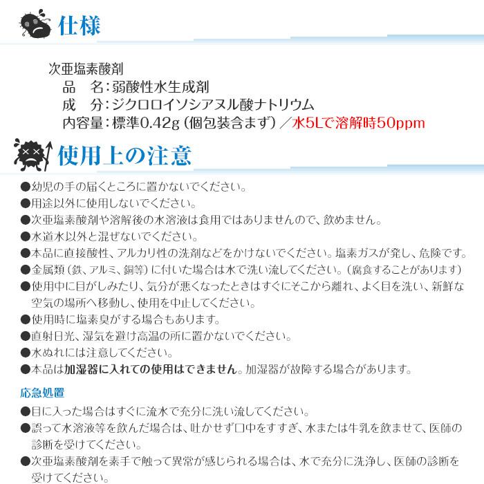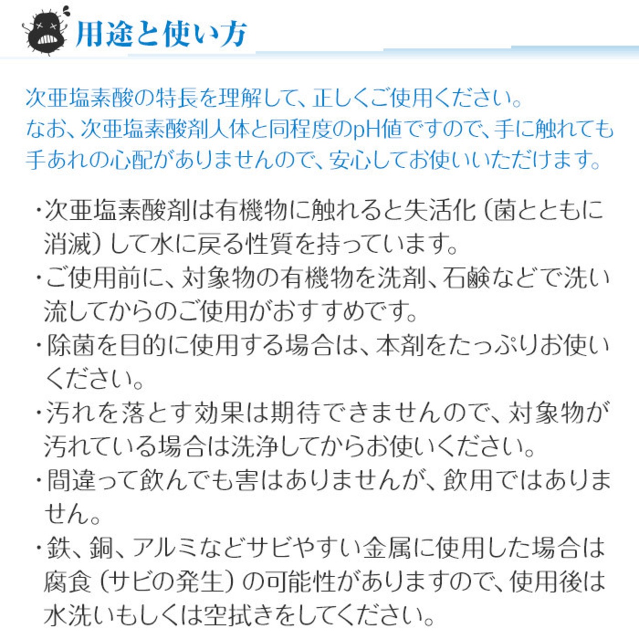 本品の水溶液にアロマオイルを滴下しないでください。次亜塩素酸の効果が低減もしくは消失します。