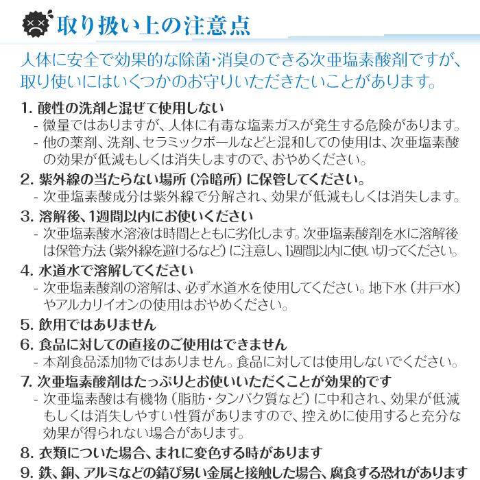 本品の水溶液に水質浄化スティック(カルキばいばい)を投入しないでください。次亜塩素酸の効果が低減もしく