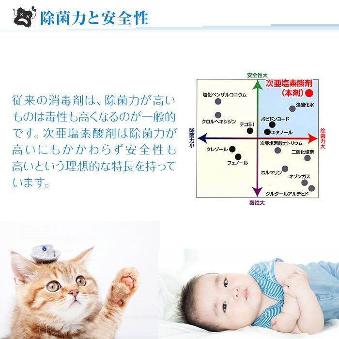 本品の水溶液にほかの薬剤の併用はおやめください。ほかの成分により「次亜塩素酸」本来の効能や効果が得られ