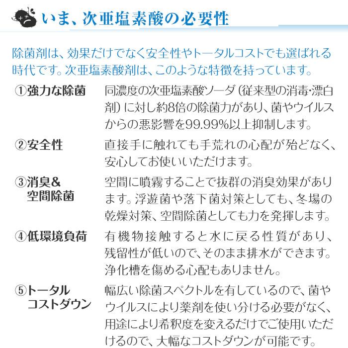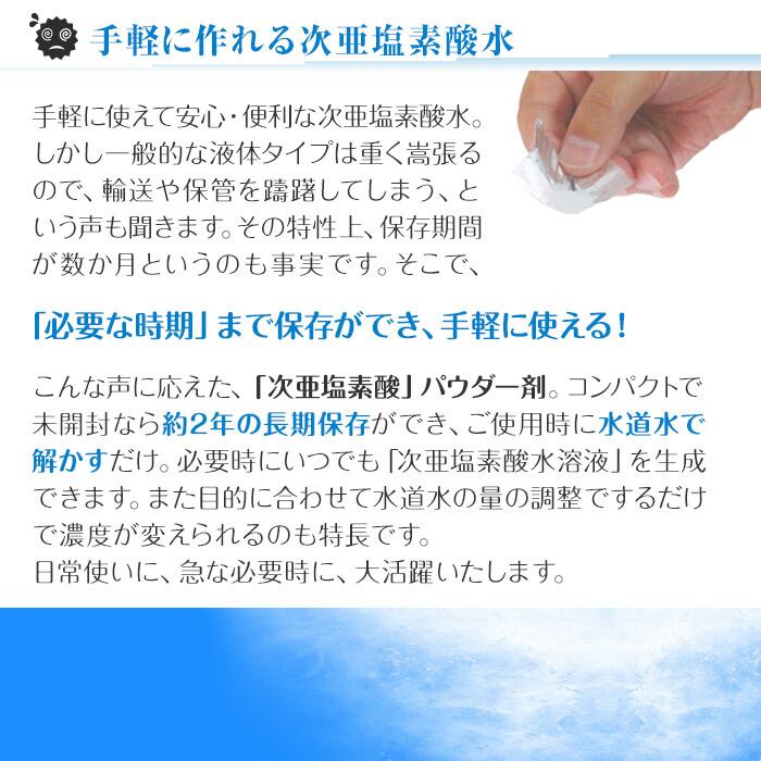 次亜塩素酸剤をタンクに1包を投入し、水に溶けきったらご使用いただけます。